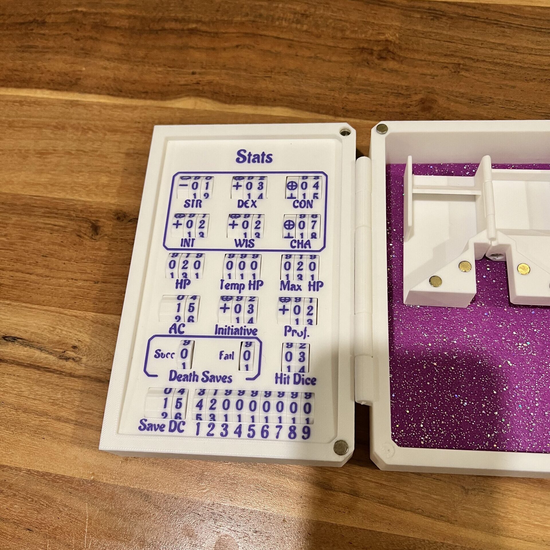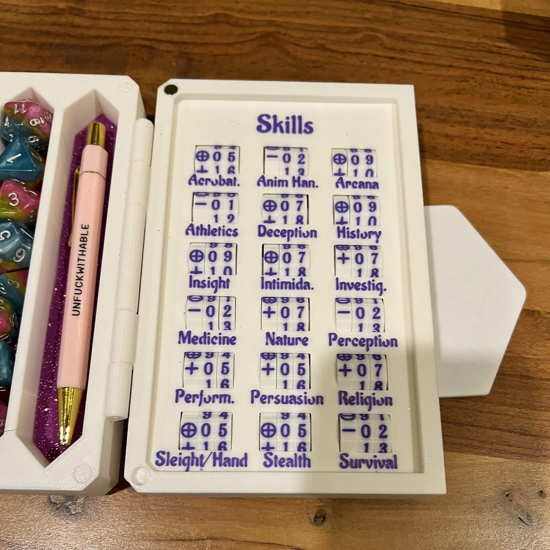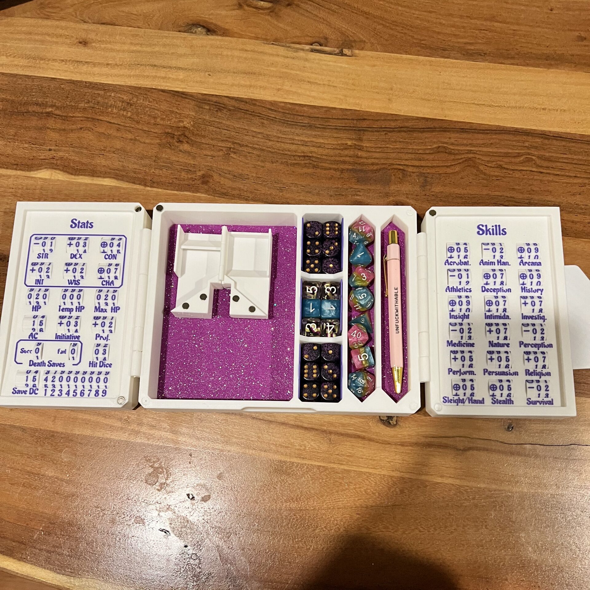 Featuring a spell slot tracker, all your core stats, and skill check details, this truly is the ultimate option for D&D enthusiasts. It comes with space to store your dice, pens, or minis, as well as a foldaway dice tower and a rolling tray that can also act as additional storage. It also comes with three dice lifters for the small compartments, but these are fully removable if you’d rather store something else in there! The latched door ensures your gear is safe between sessions and can be easily transported to and from game night.