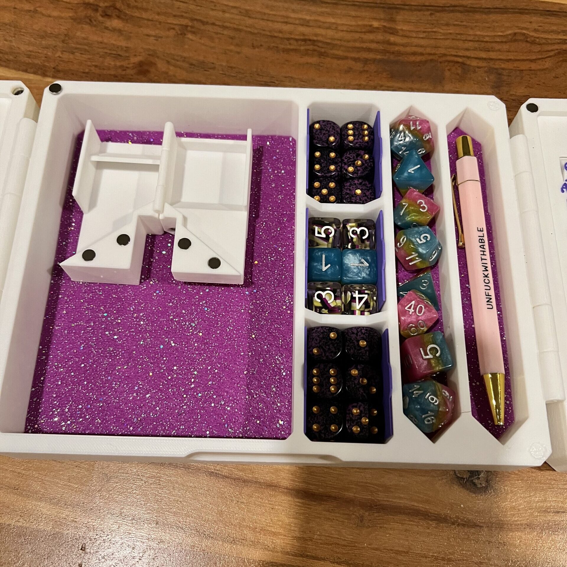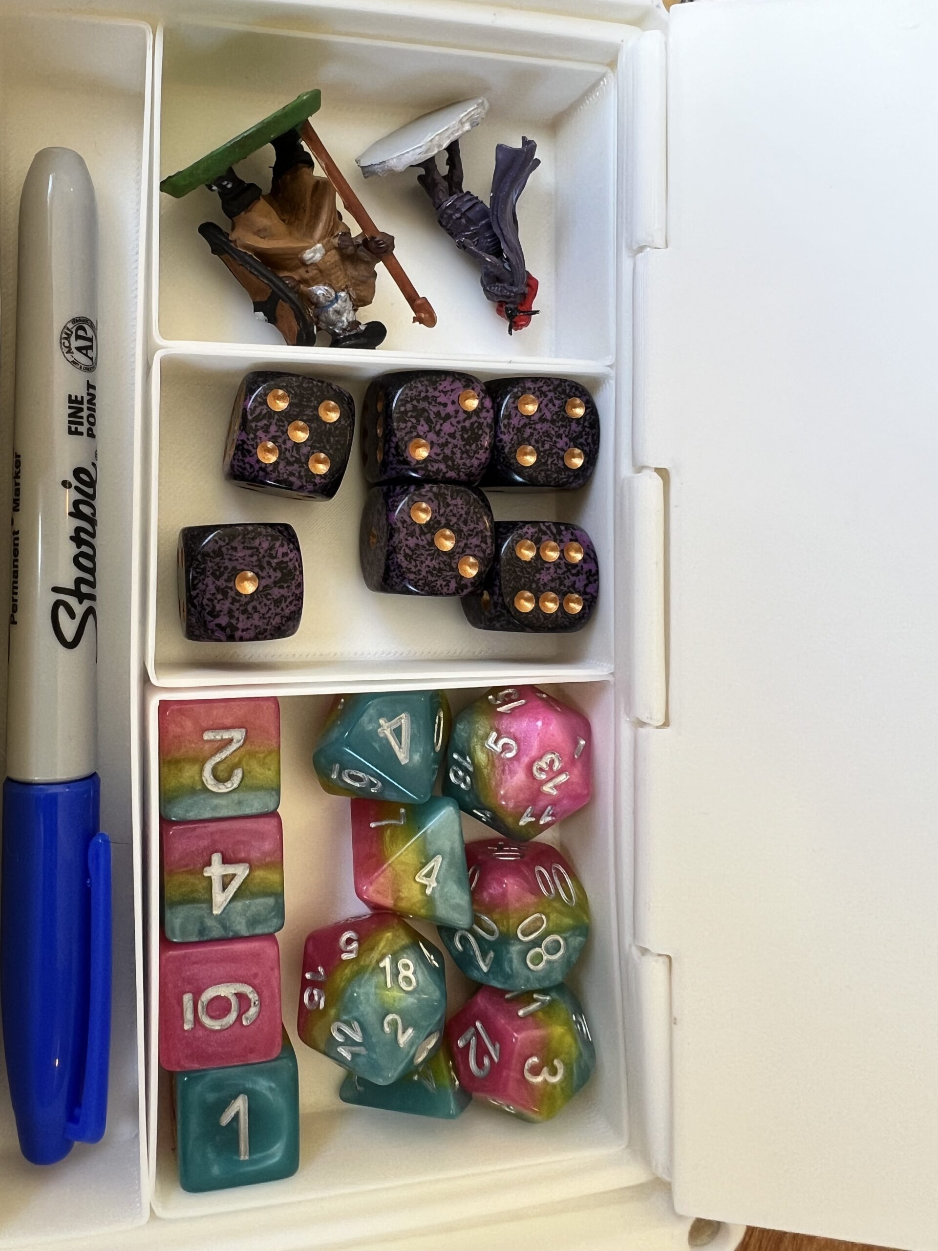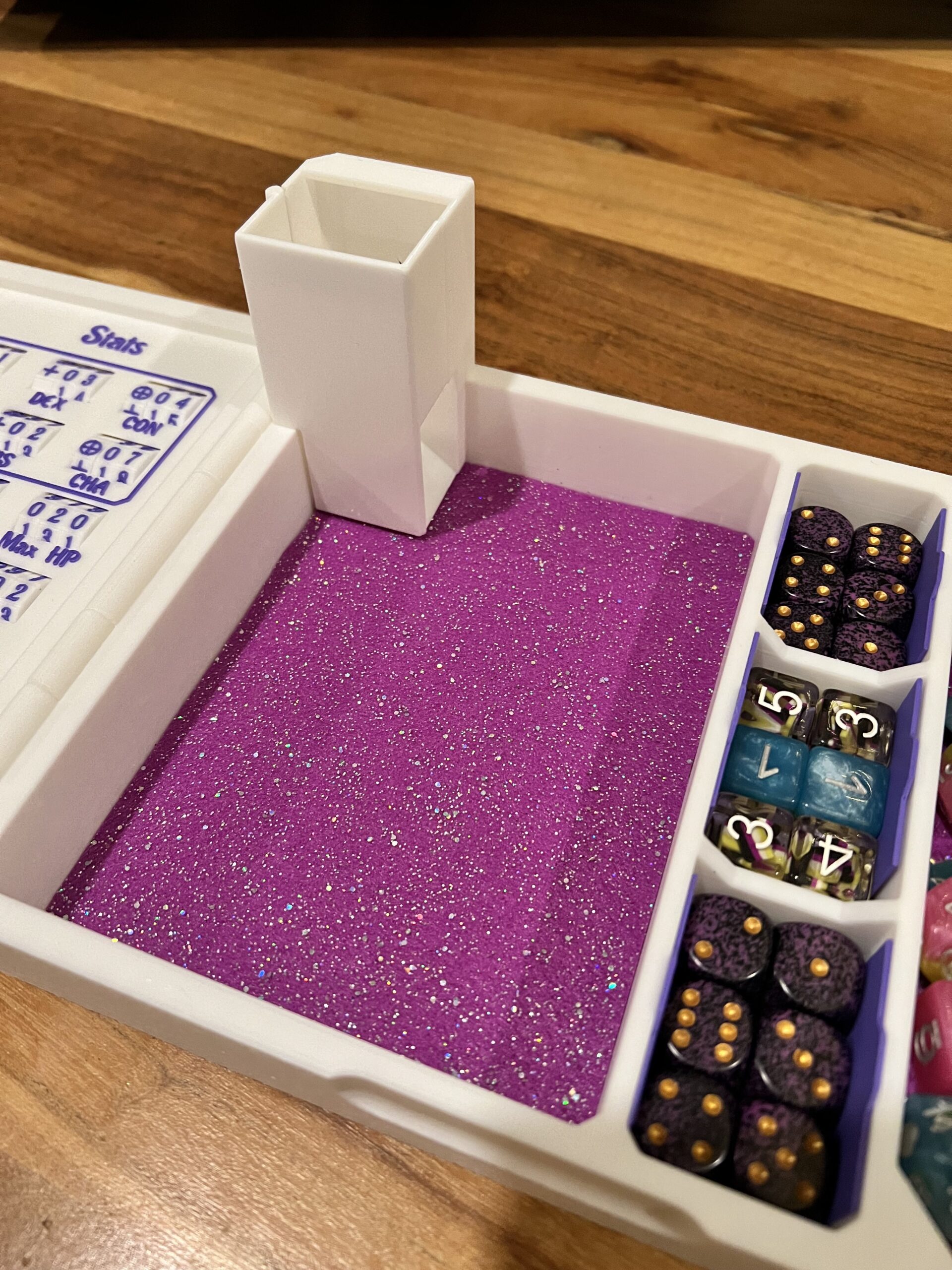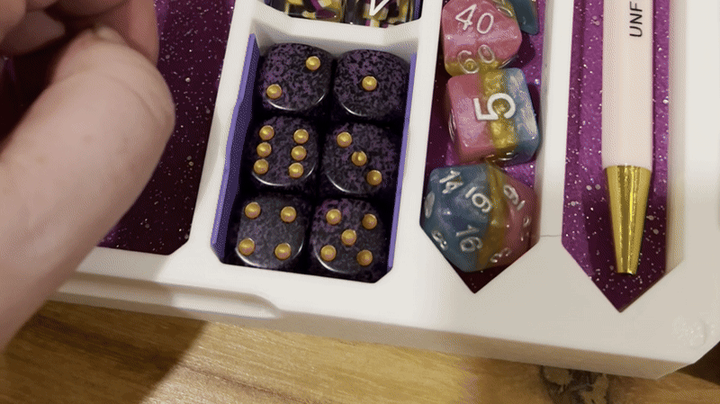 Note that the storage space is designed for standard Chessex-sized dice; if you’re playing with larger dice you may find the space doesn’t quite fit them, unfortunately.